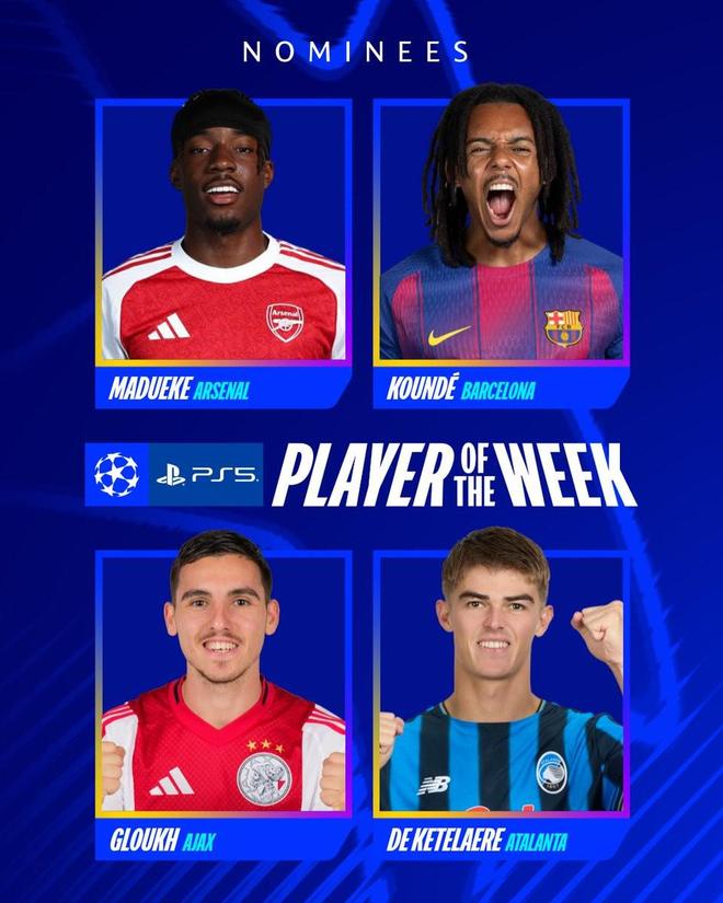 欧冠联赛阶段第6轮比赛全部结束,欧冠官方公布了本周最佳球员候选名单,分别是孔德、马杜埃凯、德凯特拉雷和格洛赫。